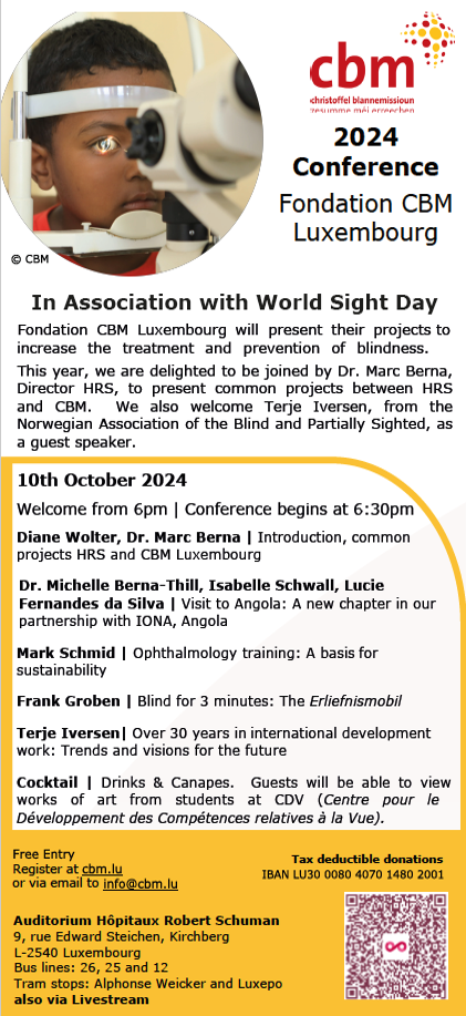 CBM Luxembourg Board members Dr. Michelle Berna-Thill, and Isabelle Schwall, along with Lucie Fernandes da Silva, a nurse at HRS, will present the latest on our project in Angola. They will recount their visit to Angola, trainings for doctors and nurses, the new Memorandum of Understanding with our local partner, IONA, as well as information on new medical devices.