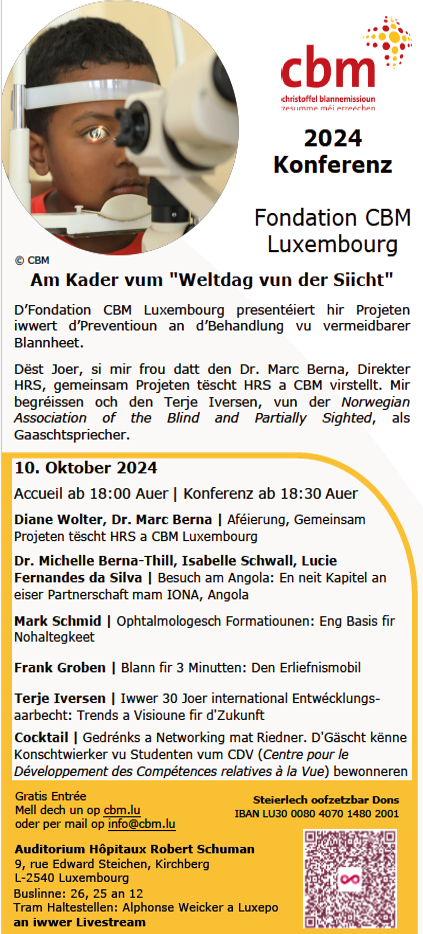 Die Verwaltungsratsmitglieder der CBM Luxembourg, Dr. Michelle Berna-Thill und Isabelle Schwall, werden zusammen mit Lucie Fernandes da Silva, Krankenschwester im HRS, aktuelle Informationen zu unserem Projekt in Angola präsentieren. Sie berichten über ihren Besuch in Angola, sowie über Schulungen für Ärzte und Krankenschwestern. Wir erfahren über das neue Memorandum of Understanding mit unserem lokalen Partner IONA, sowie über neue medizinische Geräte.